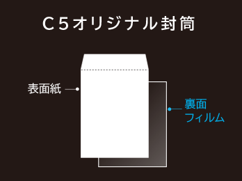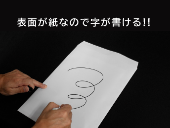 紙とフィルムを貼り付ける技術はC5にしか出来ません。片面紙のため、環境にやさしい封筒です。紙とフィルムを貼り付け、封筒として作成しているため、紙側には文字を書くことができます。